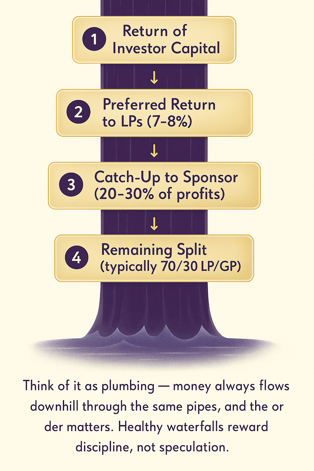 Fast forward to the finish line. The renovations are complete, rents have stabilized, and the property is either refinanced or sold. What happens next is the part every investor leans in for, the distribution of profits. This is where years of work convert back into cash flow, following a precise order of operations known as the waterfall.